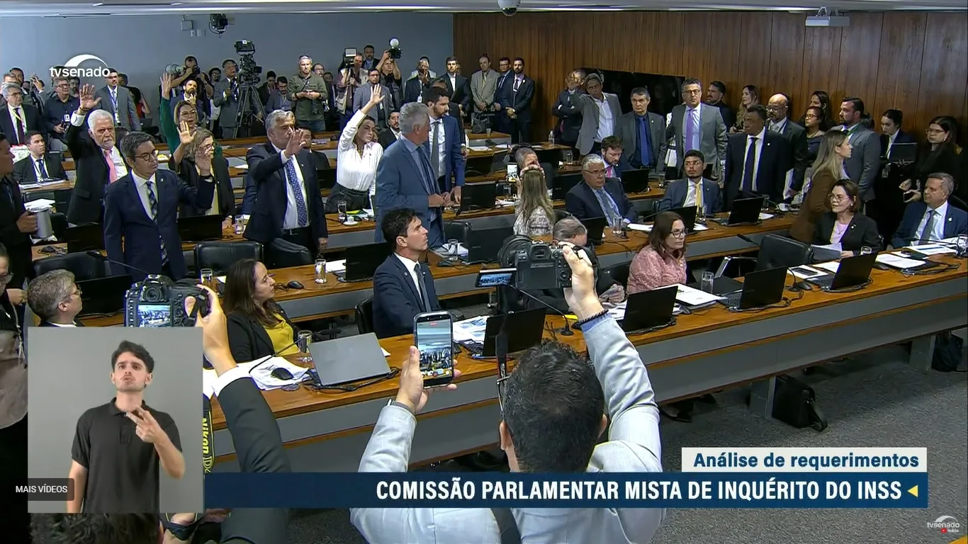 Apesar de haver 14 parlamentares levantados, Viana conta apenas 7 votos contra a proposta. “Sete… a pauta está aprovada”, afirma o presidente da CPMI do INSS, causando revolta dos parlamentares da base do governo.