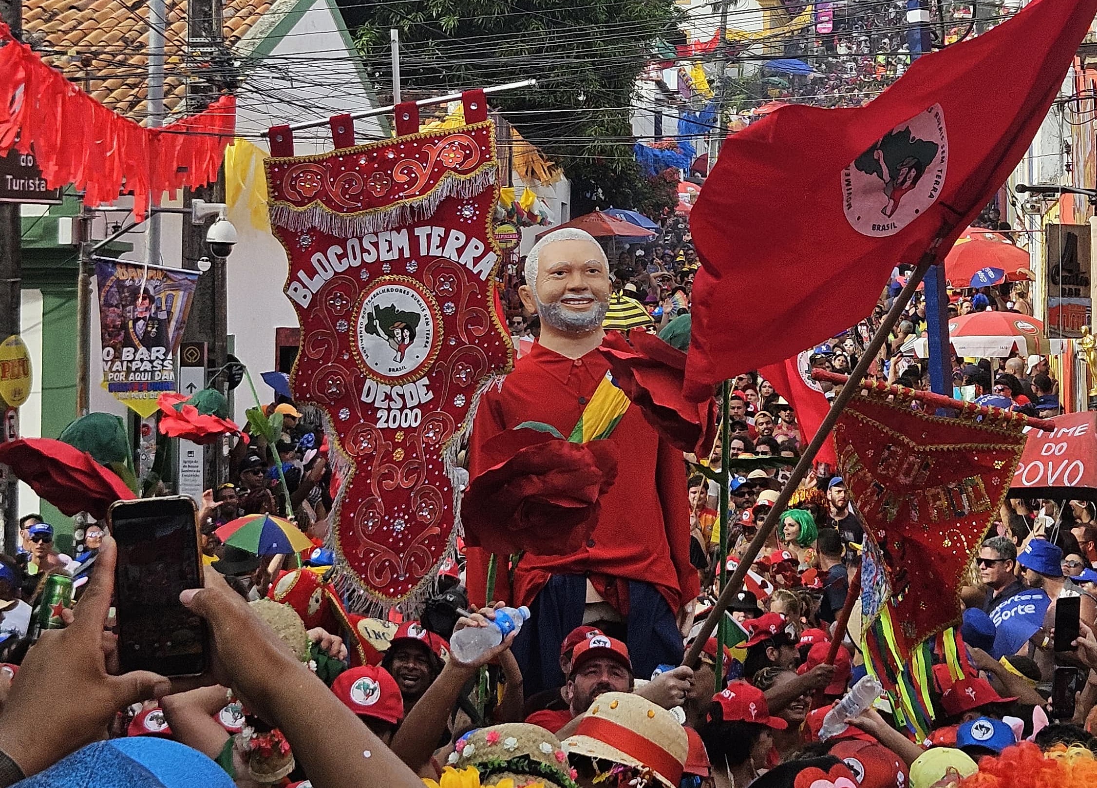 Bandeiras do MST e um bonecão do presidente brasileiro Luiz Inácio Lula da Silva e outro do presidente dos EUA, Donald Trump, também faziam parte do cortejo. No caminho, o bloco recebeu amplo apoio da população pelas ruas do Sítio Histórico, como a Rua do Bomfim.
