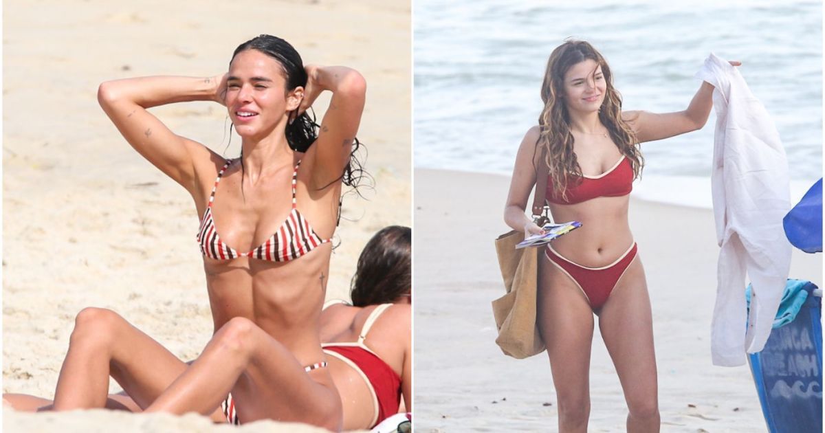 Bruna usou um biquíni listrado em tons de vermelho, marrom e bege, e Luana apostou em uma roupa de banho toda vermelha.