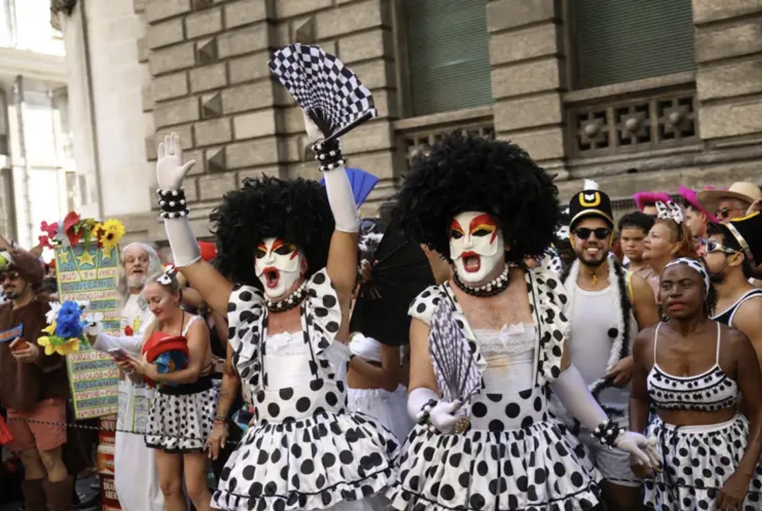 Como acontece há 107 carnavais, foliões vestindo roupas brancas com bolinhas pretas ocuparam as ruas do centro do Rio de Janeiro na manhã deste sábado (14).