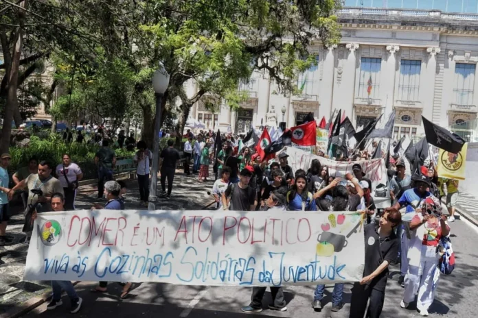 Alexandre Cordeiro Figueira, da Cozinha Solidária Olùfé e do Movimento Brasil Popular, destacou: “Este ato é muito importante pra gente garantir a segurança alimentar, pra gente garantir os nossos direitos e o direito de alimentar a nossa comunidade”