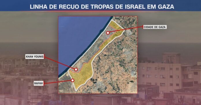 As forças israelenses permanecerão “posicionadas ao longo da linha amarela, retirando-se da Cidade de Gaza e do Corredor de Netzarim, embora ainda permaneçam em 53% da Faixa (de Gaza)”, explicou uma autoridade israelense à CNN nesta quinta-feira (9).