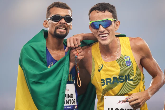 Outra dobradinha do Brasil nesta terça saiu na prova dos 1.500 metros T11 (deficiência visual), com o sul-mato-grossense Yeltsin Jacques vencendo a disputa em 4min02s02 e o paulista Júlio César Agripino garantindo a prata.