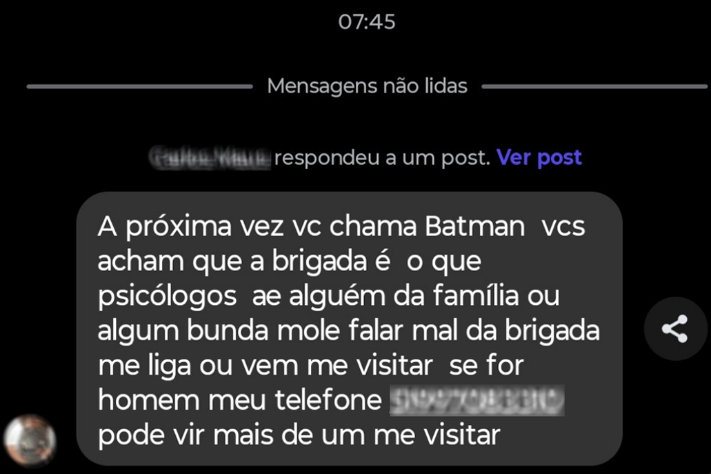 Após as publicações, o jornalista passou a receber mensagens privadas de conteúdo agressivo, ofensivo e intimidatório, enviadas por um indivíduo que se identifica alegadamente como sargento da Brigada Militar. As mensagens contêm ataques pessoais, xingamentos e incitação ao confronto, caracterizando uma tentativa de intimidação em função do trabalho jornalístico realizado.