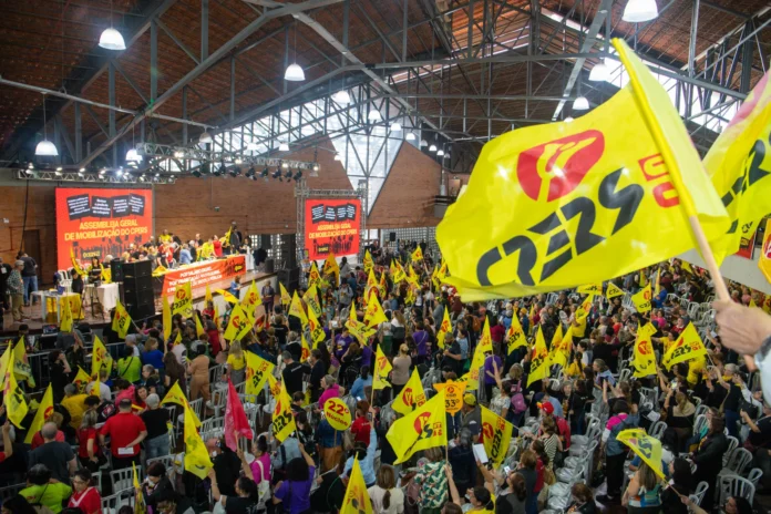 Professores, funcionários de escola e especialistas da ativa e aposentados lotaram a Casa do Gaúcho, em Porto Alegre, durante a Assembleia Geral do Cpers/Sindicato, nesta sexta-feira (3). O encontro teve como temas centrais a defesa da educação pública, a revisão da pauta de reivindicações da categoria e a rejeição ao Projeto de Lei 347/25que tramita em regime de urgência na Assembleia Legislativa e ficou conhecido entre os educadores como “PL da Meritocracia”.