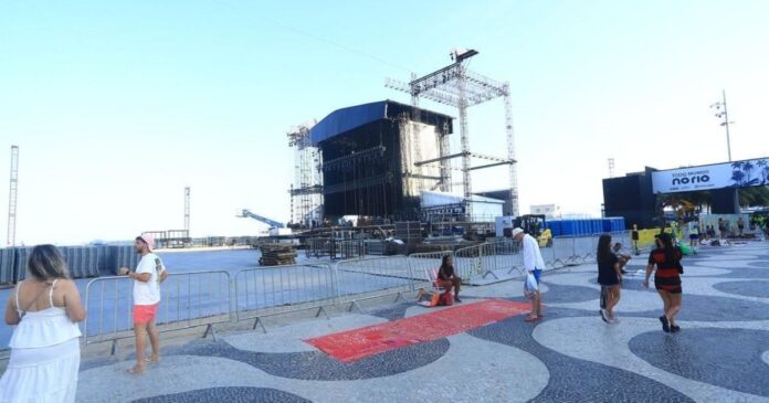 Da base até o topo, o palco terá 56 metros de altura e a passarela terá 25 metros de comprimento. Ao longo de toda a praia, a organização espalhará 16 telões de LED com 45 m² e som.