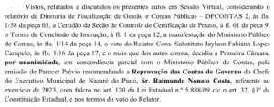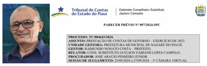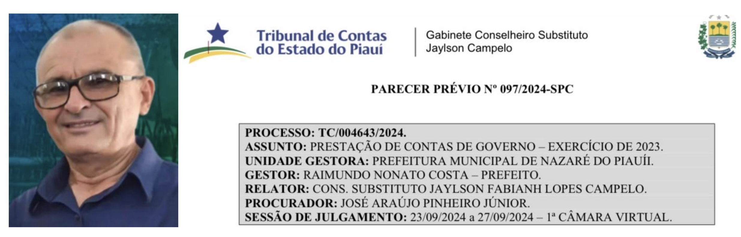 O Tribunal de Contas do Estado do Piauí (TCE-PI) emitiu o Parecer Prévio nº 097/2024, recomendando a reprovação das contas de governo do ex-prefeito Raimundo Nonato Costa, conhecido como Nonato de Abílio, referentes ao exercício financeiro de 2023, no município de Nazaré do Piauí.
