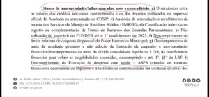 O relatório técnico revela um cenário preocupante, com falhas como estouro no limite de gastos com pessoal, irregularidades na aplicação de recursos da saúde, não aplicação de superávit do FUNDEB, dívida municipal com inconsistências contábeis, insuficiência financeira para cobrir despesas, situações que configuram violação direta à Lei de Responsabilidade Fiscal.