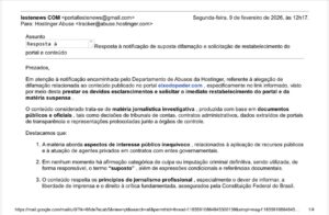 Em resposta, o portal encaminhou farta documentação, incluindo atos administrativos, registros oficiais e elementos que sustentam o conteúdo publicado. Após a análise, o Departamento de Abusos concluiu que a matéria jornalística não possui caráter difamatório, mas sim informativo, amparado pelo interesse público e pela liberdade de imprensa.